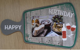 Maar gisteren was ook Ed, onze schoonzoon jarig. Hij houdt naast bier ook wel van een gezellig avondje borrelen met hapjes een wijntje dus dit kaasplankje van DDBD kwam mooi van pas. Het plaatje is van Syta en voor een gedeelte gemat op een mal van Joy!Crafts net als de fles met glaasjes. Het papier is van SL en de tekst van Ali.